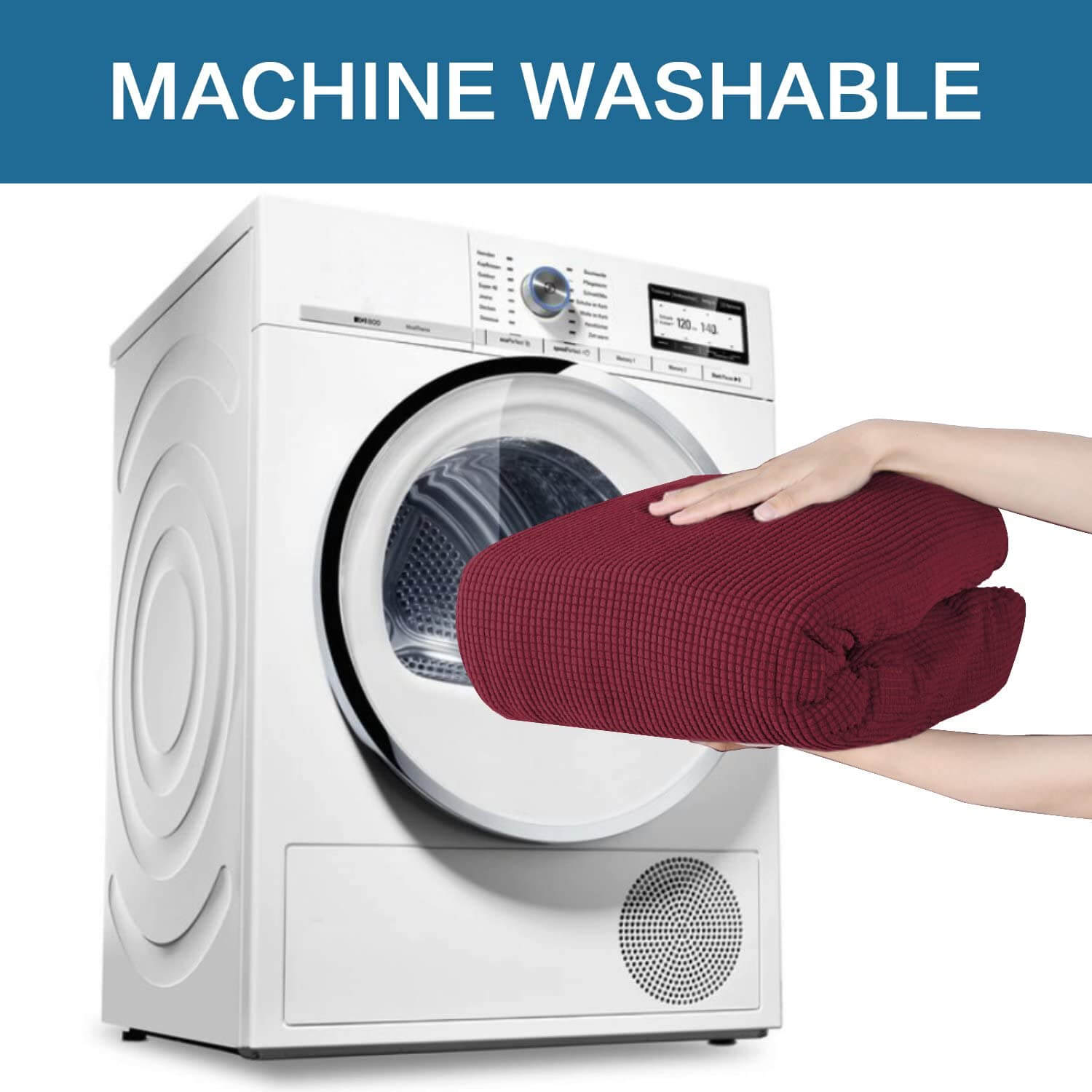 Husă pentru canapea 3 locuri, culoare bordo, realizată din microfibră (96%) și spandex (4%), material elastic și rezistent. Potrivită pentru canapele de 180–225 cm, detasabilă, lavabilă la 30–40°C, modernă și ușor de întreținut.