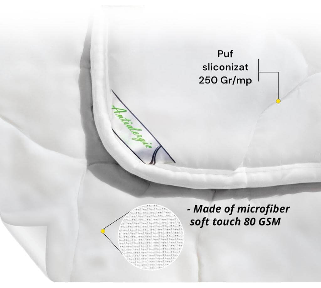 - Umplutură: Umplutura pernelor este realizată din puf siliconizat antialergic, oferind un suport confortabil și durabil.